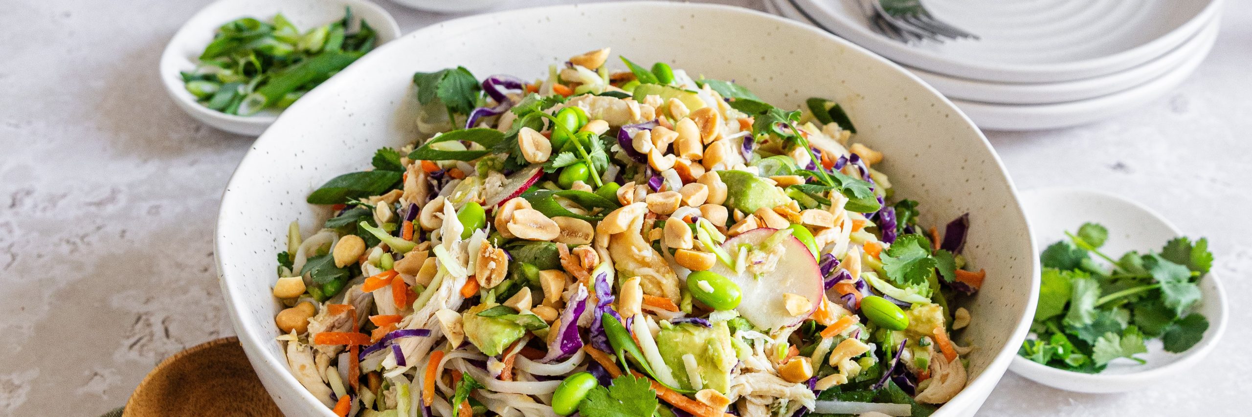 - Place the cooked noodles in a large bowl along with the LeaderBrand Broccoslaw, shredded chicken, edamame, radish, avocado, coriander and spring onion. Pour over the dressing and toss well to combine.