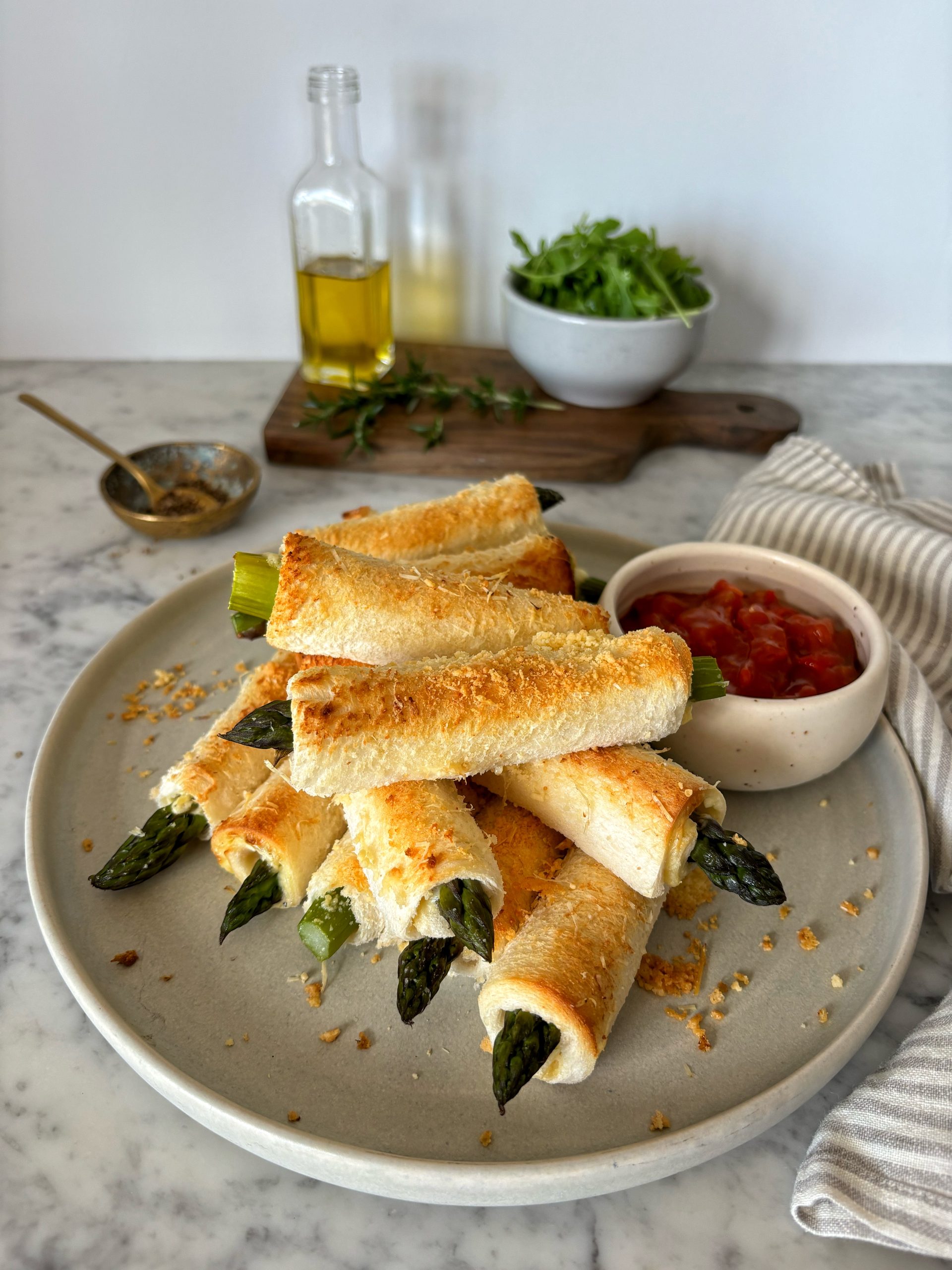 Spread each slice generously with the lemon cream cheese then lay a piece of asparagus across the center and roll up tightly, transfer to a lined baking tray.