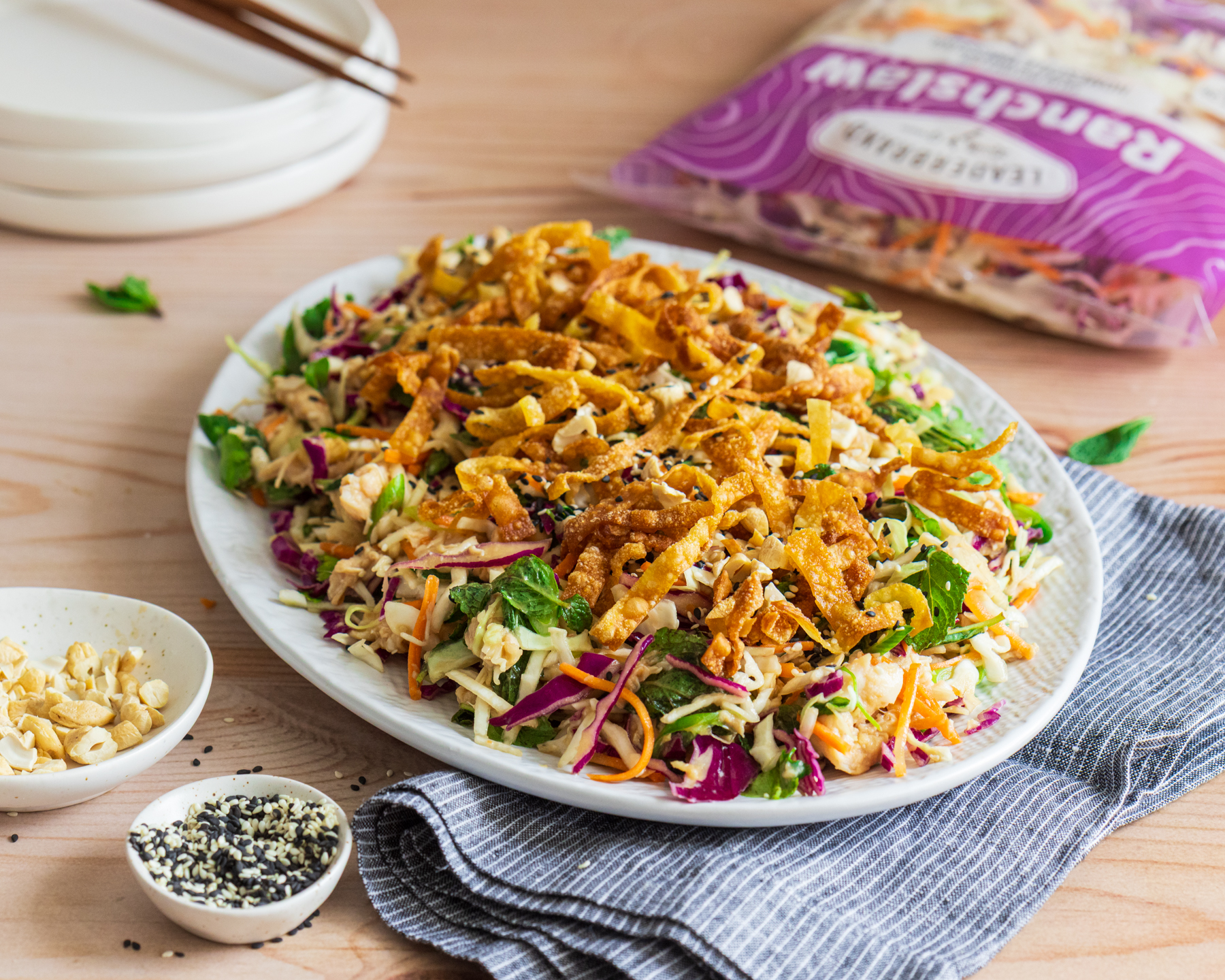 - Transfer to a serving bowl or plate and top with the crispy wonton strips, remaining cashew nuts and sesame seeds.