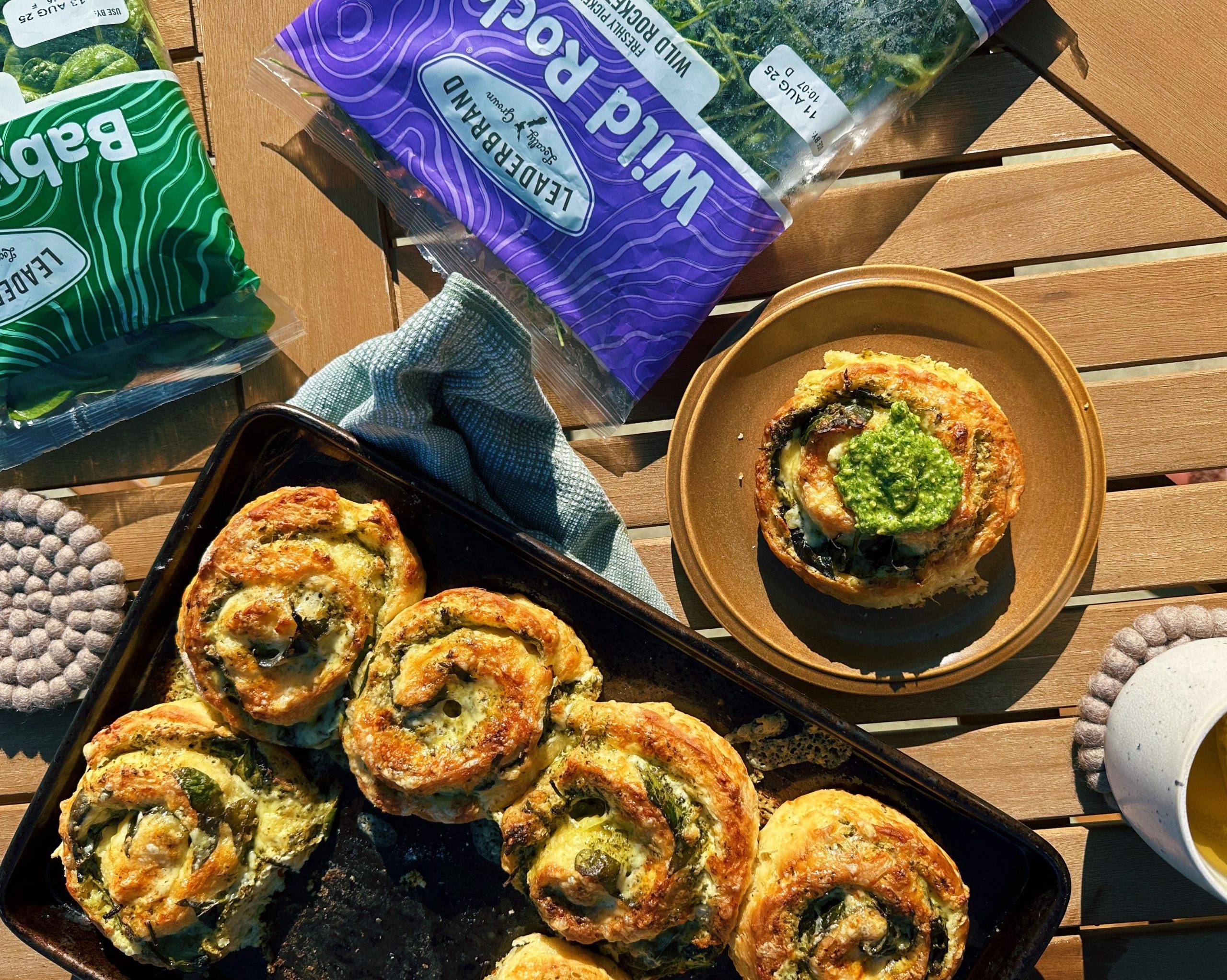 - Tip the dough onto a lightly floured surface and roll it out to a rectangle approximately 30 × 22 cm, about 1 cm thick (don’t knead). Spread the softened cream cheese evenly over the dough, leaving a 1 cm border along one long edge. Then, approximately ¾ of a batch of pesto; sprinkle with 90g of grated cheese and LeaderBrand Baby Spinach. Brush the 1 cm border with water. Starting from the opposite long edge, roll into a tight log and pinch the seam to seal (place seam-side down). Trim the ends, then slice into 10 even scrolls.